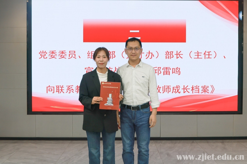 邱雷鸣向联系教师代表陈亚亚赠送《思政课教师成长档案》。他希望青年教师要用好成长档案,做好职业发展规划,精心记录收获,深入剖析问题,经常反思悟学,促进思政课教学能力提升。